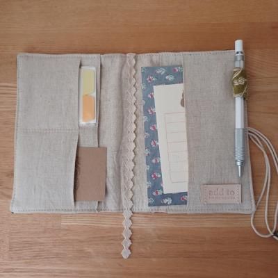 内側は書くことや読むことの邪魔にならないようにシンプルな綿麻を使用しており、少しシワが入った質感もこだわりのポイントです。